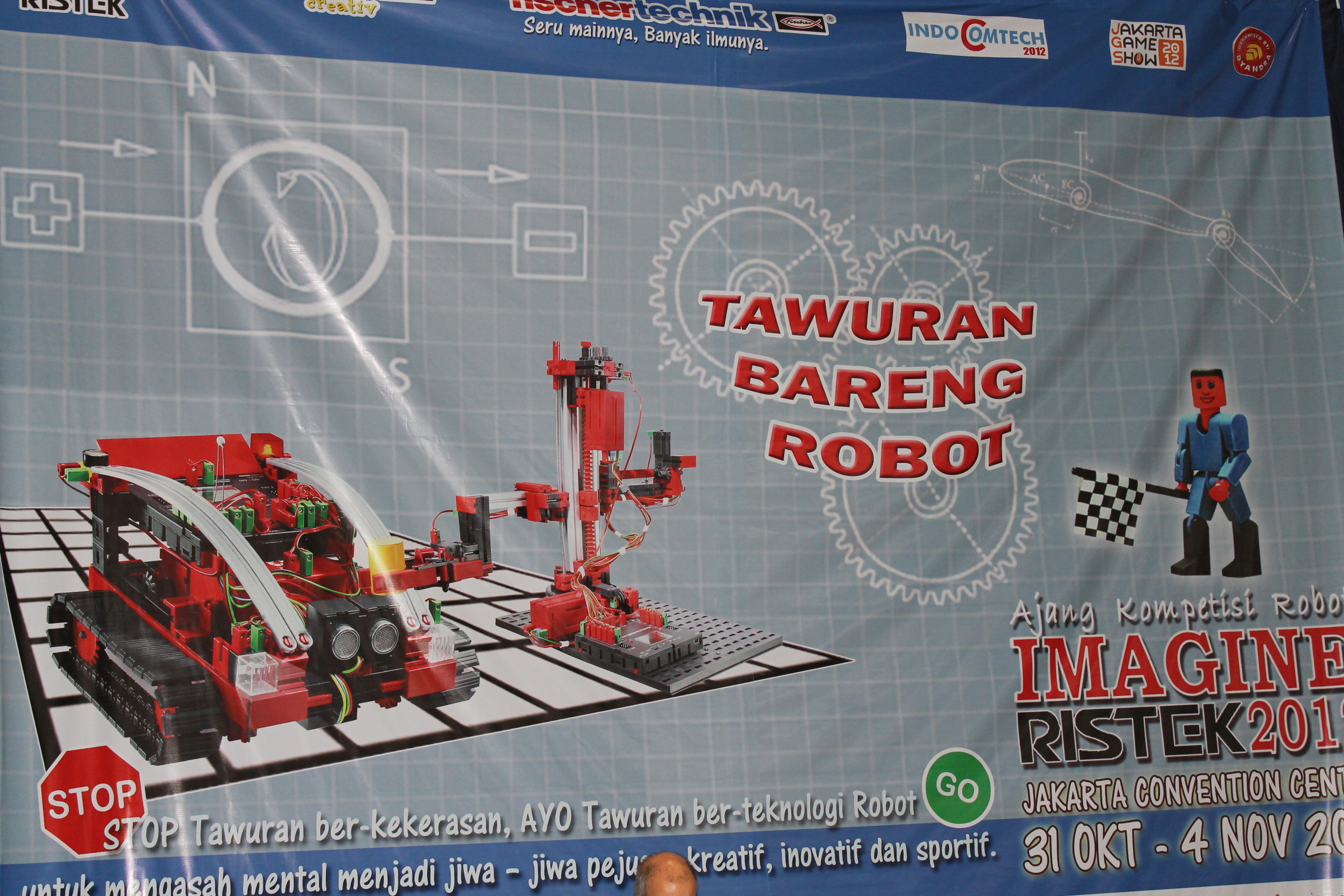 Pokoknya nih bagi kalian para gamers pastinya akan dimanjakan deh di Jakarta Game Show 2012. Selain kalian bisa bermain game gratis, kalian juga bisa sharing pengalaman bermain game kalian loh dengan berbagai ahli game yang ada disana. Diantara semua itu, ada stand yang paling menyedot perhatian para pengunjung nih guys. Stand tersebut dinamakan Tawuran Bareng Robot. Hmm.. Dari judulnya aneh juga ya? Kenapa dinamakan Tawuran bareng robot? Yap karena memang dalam stand ini para ahli pembuat robot bertarung untuk membuat robot canggih dan pastinya menjadi pemenang siapa yang terbaik dalam pembuat robot.