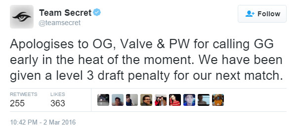 Walaupun begitu, pihak panitia masih menyatakan bahwa Team Secret keluar sebagai pemenang dengan catatan mereka terkena hukuman berupa "level 3 draft penalty" di pertandingan berikutnya saat melawan Evil Geniuses. Tentunya hal ini akan cukup merugikan Team Secret apalagi pertandingan tersebut merupakan babak semi final upper bracket.