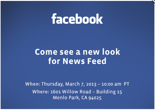 Setelah baru-baru ini Facebook meluncurkan search Engine baru yang mutakhir dan sudah bisa kita nikmati yaitu Graph Search, 2 hari mendatang atau tepat pada tanggal 7 maret 2013 akan mengadakan suatu acara besar yang diprediksi dalam acara tersebut Facebook akan meluncurkan fitur barunya. Apa itu? Sayangnya kali ini Mark merahasiakan hal ini. Tapi seperti yang diberitakan oleh sebuah media Internasional yang telah mendapat undangan dari Facebook tersebut yaitu NBC News, Facebook menyebarkan undangan yang dimana lagi-lagi undangan ini menarik minat di kalangan media dunia. Hal ini dikarenakan undangan ini ditujukan untuk umum dan menjanjikan sesuatu yang baru dari Facebook. Isi dari undangan tersebut sangatlah singkat dan tidak ada kata penutup atau pembuka. Undangan tersebut hanya mengatakan "Come see a new look for News Feed, Thursday March 7, 2013- 10:00 Am PT".