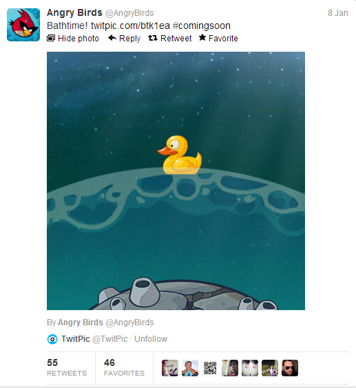 Yap mungkin kalian masih bertanya-tanya dan bingung nih apa maksud dari Angry Birds akan nyemplung ke air? Yah memang nih sob sebenarnya berita ini juga masih agak misterius dan membuat kita menebak-nebak. Pasalnya Rovio sang pembuat Angry Birds sepertinya ingin meluncurkan Angry Birds baru versi air loh. Kenapa kita berspekulasi demikian? Pasalnya nih sob beberapa waktu lalu, ada sebuah gambar bebek tiba-tiba muncul di 3 account jejaring sosial perusahaan pembesut game Angry Birds ini Rovio. Nah loh kira-kira arti dari gambar bebek itu apa ya?