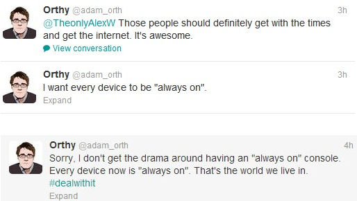 Meski Microsoft telah mengungkapkan permintaan maaf secara resmi, perusahaan yang berbasis di Redmond ini melalui Xbox Community Manager, Larry Hryb, juga mengungkapkan bahwa apa yang dilakukan oleh Orth, tidak mencerminkan perusahaan secara keseluruhan. Fitur "Always On, Aways Connected" merupakan sebuah kemampuan yang akan membuat konsol selalu terkoneksi pada jaringan internet dalam keadaan menyala. Sehingga pengguna tak perlu repot-repot melakukan pembaruan dari setiap permainan yang dimainkan. Tapi bagaimana jika gamers yang tidak mempunyai koneksi aktif atau suatu saat jaringan internet mati? Bagaikan konsol mati Xbox pun akan mati juga? C'mon Microsoft it doesn't make any sense.