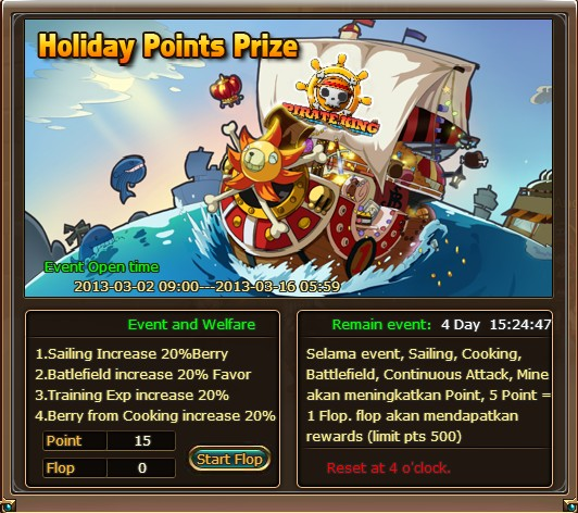 Menyemarakkan peluncuran Server Baru Pirate King, yakni server Luffy dan Zoro, Tim Pirate King menghadirkan event baru yang sangat menguntungkan! Eits, meski event ini diadakan untuk menyambut server baru, tapi tetap berlaku untuk seluruh server Pirate King lho, Wah, keren banget!