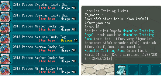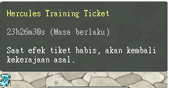 2. Cara memakai Hercules Training tiket dengan cara mengklik kanan pada gambar Ticket tersebut. 1 Hercules Training Ticket berlaku selama 24 jam (dihitung saat dipakai). Apabila durasi telah habis, maka Angels akan dikeluarkan dari training area