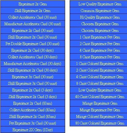 Dan jika kalian menggunakan item - item di bawah ini, kalian akan merasakan efek lebih, sebagai contoh, jika kalian menggunakan Experience 2x Card kalian akan mendapatkan efek 3x Experience ketika membunuh monster, dan jika kalian menggunakan Experience 3x Card kalian akan mendapatkan efek 4x Experience ketika membunuh monster, dan seterusnya,(Max 5x)dan item – item yang mengalami penambahan efek saat di gunakan di Hercules Training Area dapat kalian lihat di bawah ini: