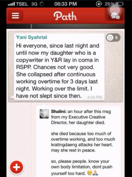 Mita Diran, seorang copywriter muda berumur 27 tahun, meninggal dunia pada hari Minggu tanggal 15 Desember 2013 akibat bekerja selama 3 hari non-stop.