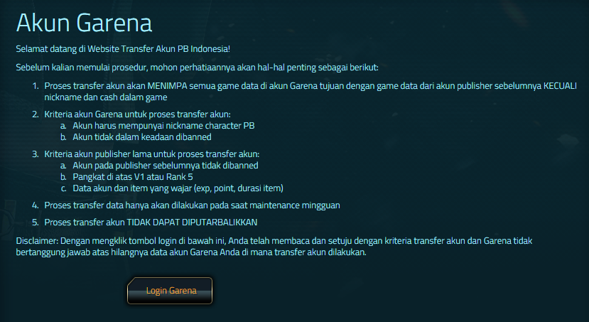 Di tahap pertama, kalian akan diberikan berbagai informasi penting terkait migrasi akun Point Blank. Sebelum melakukan transfer akun, pastikan kalian telah membaca segala ketentuan agar tidak terjadi kesalahan dalam proses migrasi akun Point Blank.