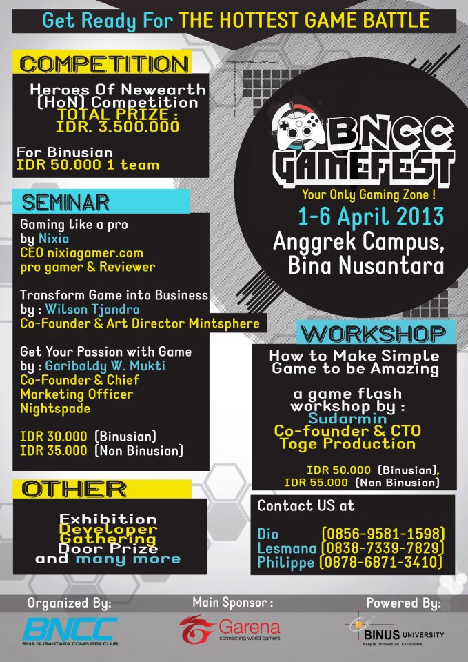 Bagi para pecinta game, game developer, studio game, dan semua pelaku dalam industri game siapkan diri Anda untuk menghadiri acara BNCC Gamefest 2013 game festival pertama yang diadakan di Binus University. Setelah sukses mengadakan Alvion 2012, BNCC kembali melakukan terobosan spektakuler dengan mengadakan BNCC Gamefest 2013.