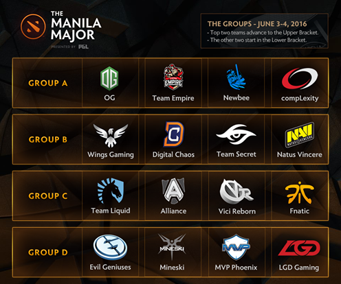 Sang pemenang Frankfurt Major yakni OG, masuk di grup A bersama Team Empire, Newbee, dan juga Complexity Gaming. Sedangkan di grup B, bisa dibilang grup neraka karena diisi oleh tim-tim besar seperti Wings Gaming, Digital Chaos, Team Secret, dan juga Na'VI. Sang juara turnamen Dota 2 Epicenter yakni Team Liquid, berada di grup C bersama Alliance, Vici Reborn dan juga Fnatic. Sedangkan sang juara The International tahun lalu yakni Evil Geniuses, berada di grup D berdampingan dengan Mineski, MVP Pheonix dan LGD gaming.