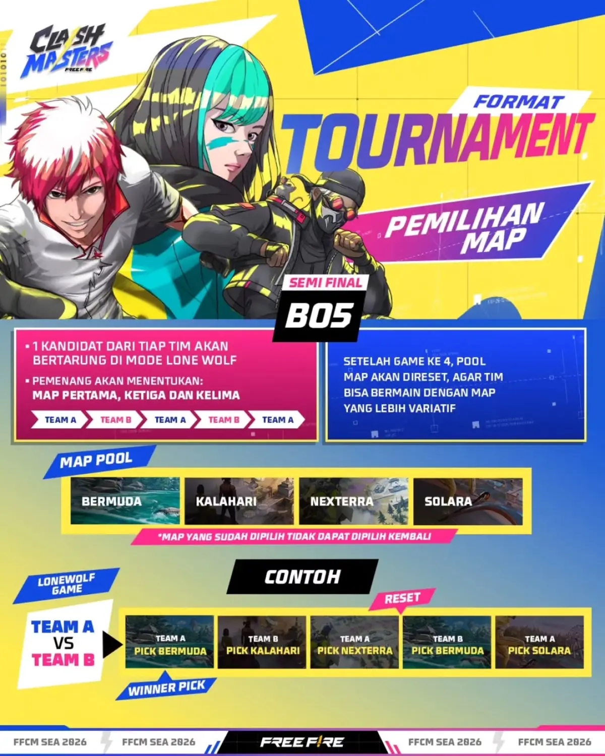 Reset Map Pool: Setelah game ke-4, pool map akan direset agar babak penentuan tetap terasa juara dan tidak membosankan.