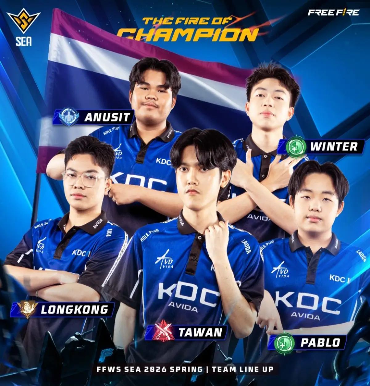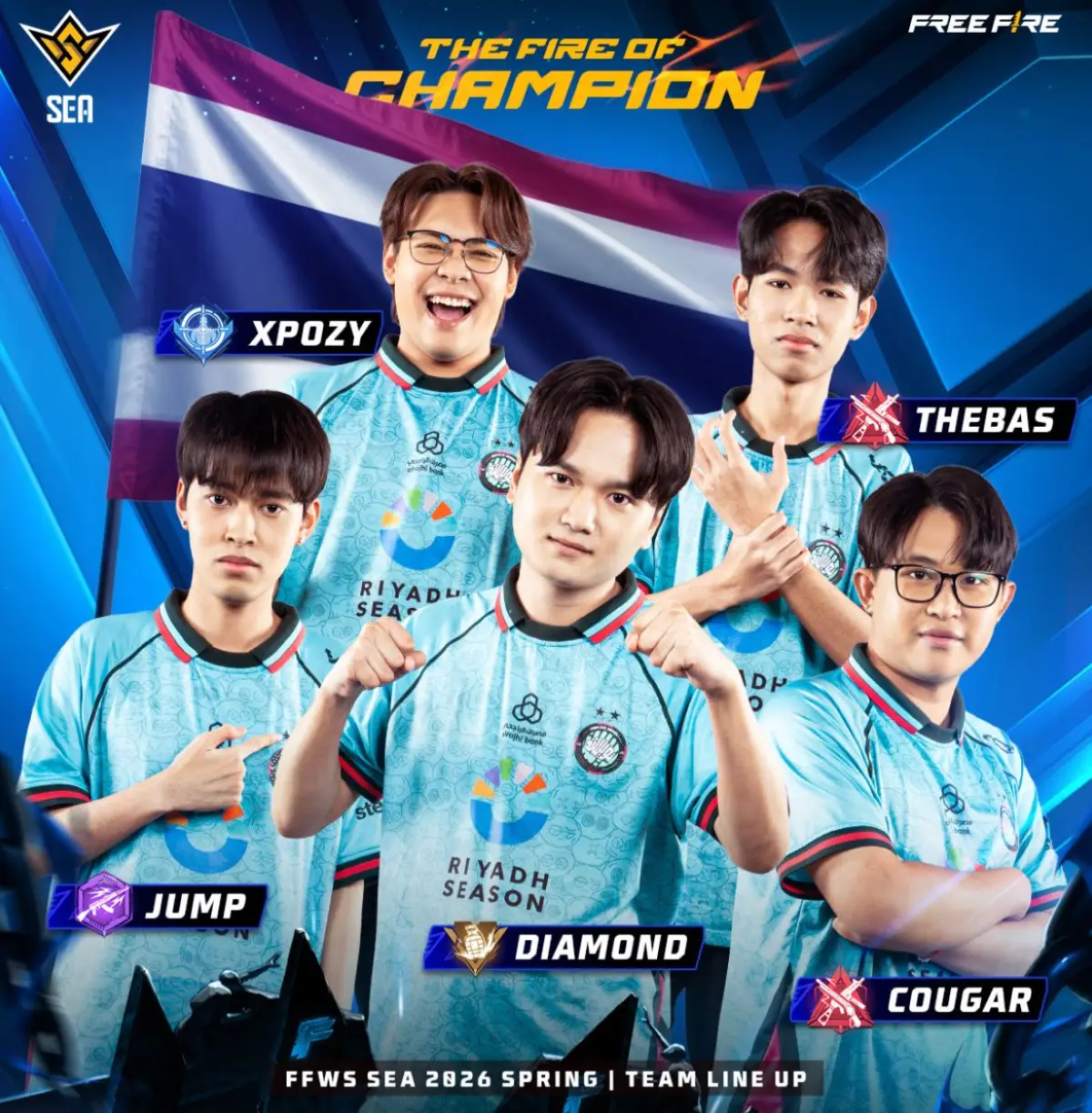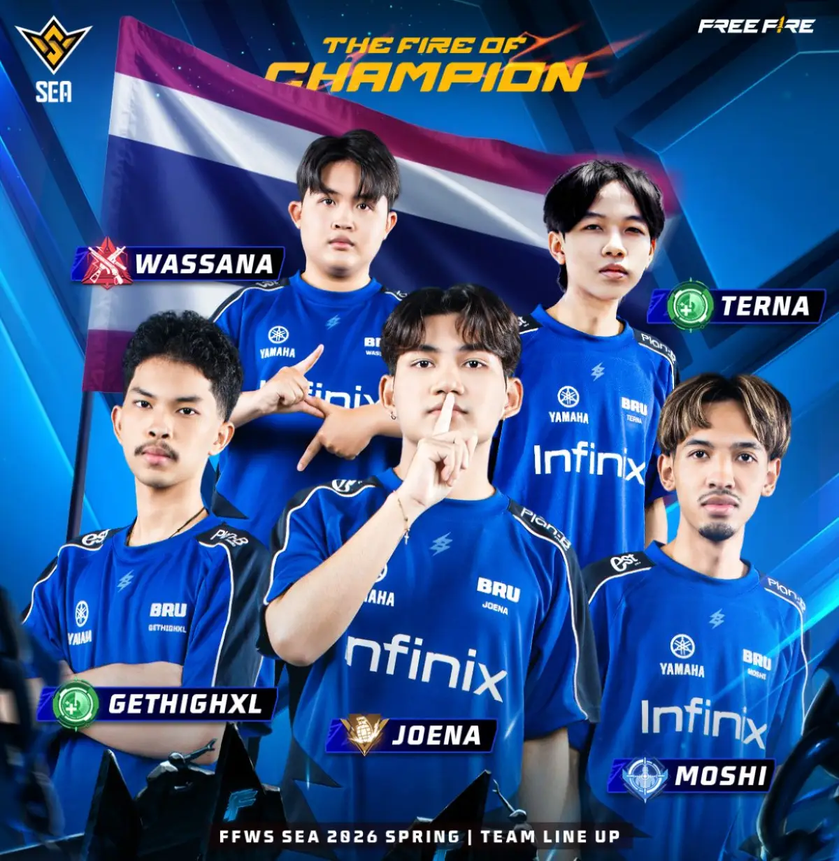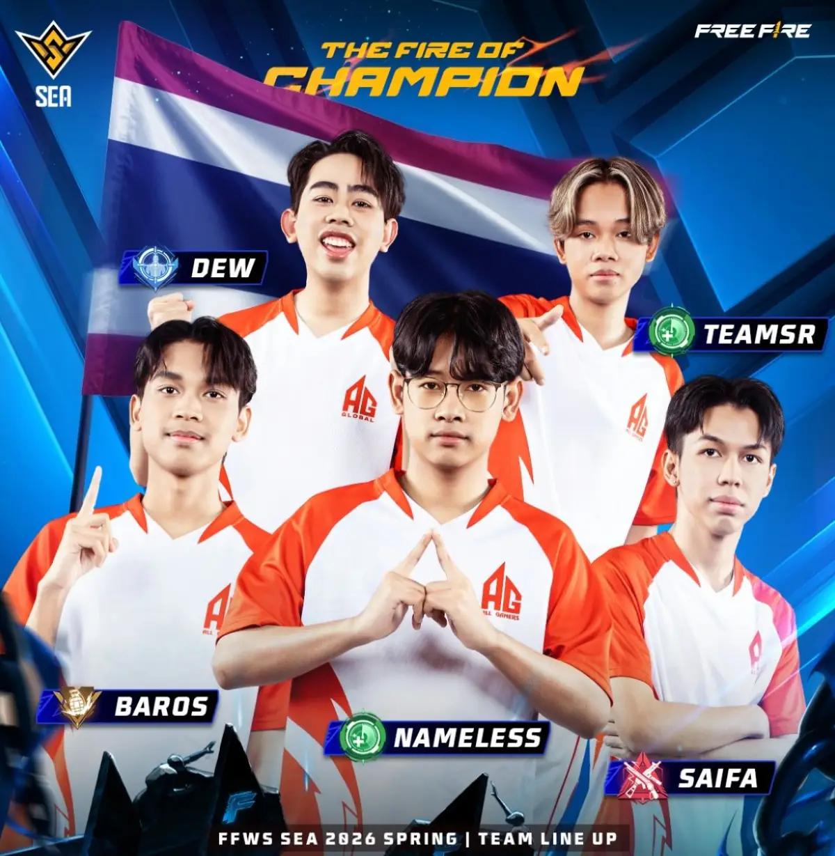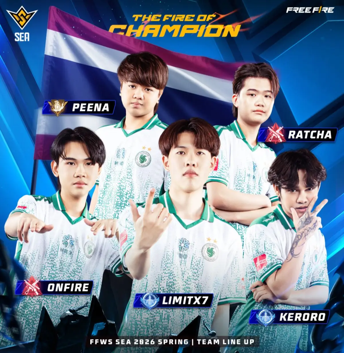 Dengan gaya bermain agresif, tim ini menonjol di ajang Free Fire Thailand Series 2026 Spring, berhasil lolos ke FFWS SEA 2026 Spring sebagai salah satu dari lima kuota Thailand melalui performa solid di fase kualifikasi lokal. Mereka dikenal kompetitif di scene domestik dengan hasil top 6 di beberapa event Thailand sebelumnya. Berikut rosternya:
