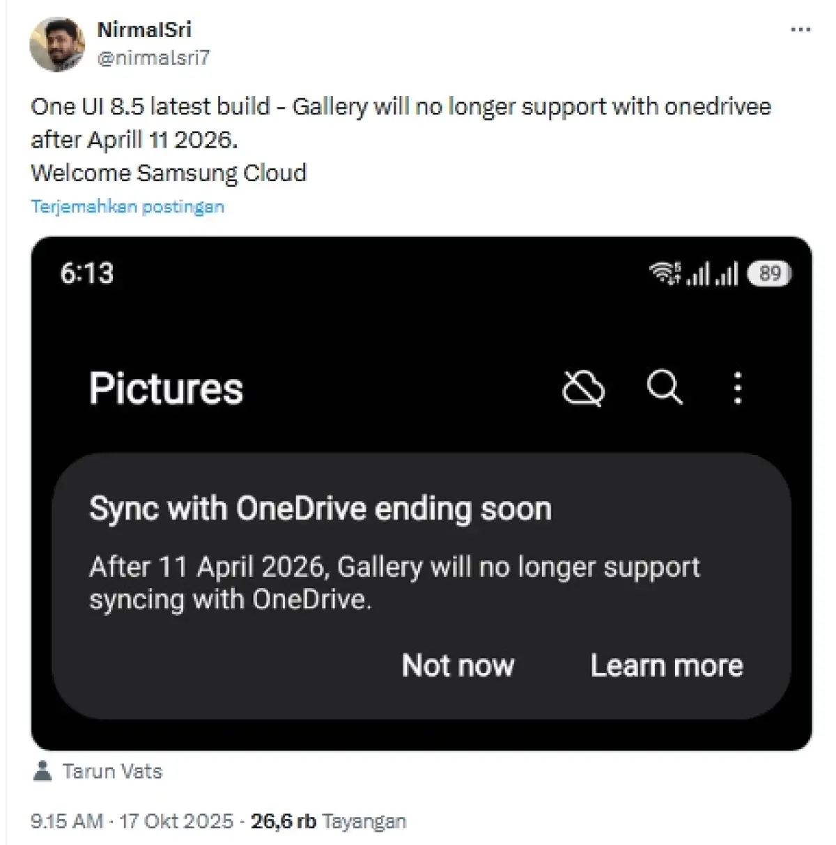 Menurut bocoran dari build One UI 8.5, Samsung akan menghentikan penggunaan OneDrive mulai 11 April 2026. Setelah tanggal tersebut, pengguna tidak lagi dapat menyinkronkan foto atau video dari aplikasi Samsung Gallery ke OneDrive. Semua sinkronisasi otomatis akan dialihkan ke Samsung Cloud.