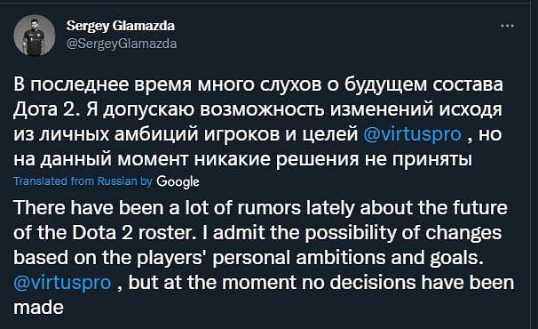 General Manager Virtus.pro mengindikasikan perubahan roster Dota 2 dari organisasi eSports asal Rusia itu. (Twitter/@SergeyGlamazda)