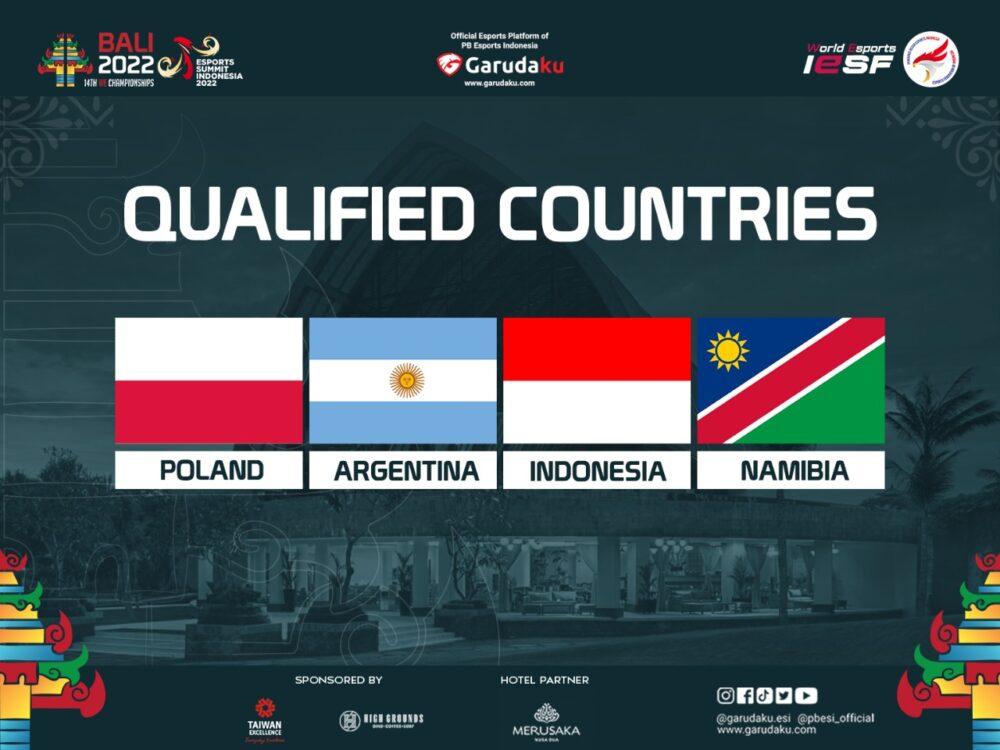 Untuk perwakilan dari Asia, tidak ada kualifikasi terbuka. Indonesia sebagai tuan rumah sudah bisa dipastikan akan tampil dan beraksi di acara utama Bali 14th World Esports Championship. Dengan keseluruhan hasil ini, kuota dari Bali 14th World Esports Championship sudah terisi semua. Polandia akan mewakili Eropa, Argentina akan mewakili wilayah Panam, Namibia akan mewakili Afrika dan Indonesia akan mewakili Asia.