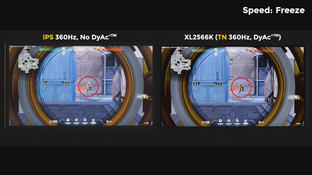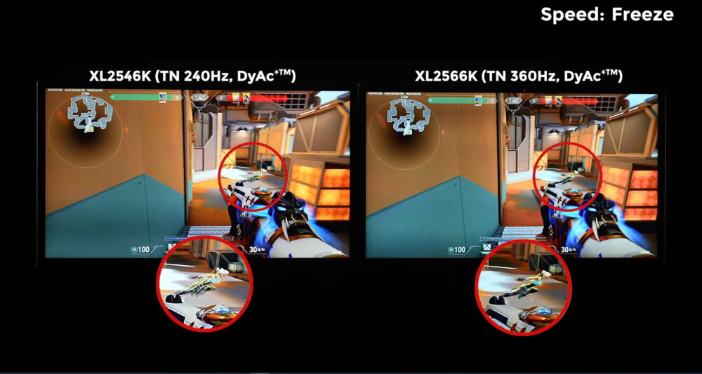 DyAc+ pada XL2566K membuat aksi ekstrim di dalam game seperti spraying menjadi lebih jernih daripada DyAc+ pada XL2546K. Kejelasan tampilan dapat membantu gamer untuk melihat posisi musuh saat bergerak cepat atau target yang bergerak cepat dengan lebih mudah dan melihat lintasan peluru dengan lebih jelas sehingga dapat membantu recoil control dan aim. Dibandingkan dengan layar IPS 360Hz pada umumnya, DyAc+ pada panel TN 360Hz bisa memberikan outline yang lebih jelas sekaligus lebih tajam dari gambar bergerak secara keseluruhan sehingga membantu gamer untuk fokus serta mengurangi gangguan dari afterimage yang tidak diinginkan dalam game.