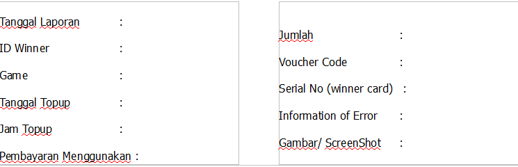 Untuk kalian jika ada permasalahan dengan Top Up. Jangan hanya bilang ke GM yang sedang bertugas, coba deh kalian kirim ke email [email protected]. Kami akan memproses Error Top Up kalian jika kalian mengirim email. Dan kalian harus mengisi format laporan Error Top Up Sebagai berikut;