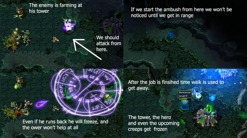 - Time Walk dapat membuat kalian kabur yang sangat jauh dengan sangat mudah. Proses saat kalian menggunakan skill ini sangatlah menguntungkan karena kalian akan kebal. Gunakan Time walk ke daerah yang terpencil seperti forest dengan blindspot dan arahkan timewalk ke daerah suduh mati pepohonan agar musuh tidak dapat mencapai daerah tersebut lalu teleport dengan tele. Kaburlah dengan time walk bukan menjauh dari musuh tapi ke arah yang tidak bisa ditebak musuh. Jika kalian kabur menggunakan time walk untuk menjauhi jarak dan tidak menghilangkan jarak pandang, maka musuh tetap akan bisa mengcast ilmunya dan kalian akan tetap mati.