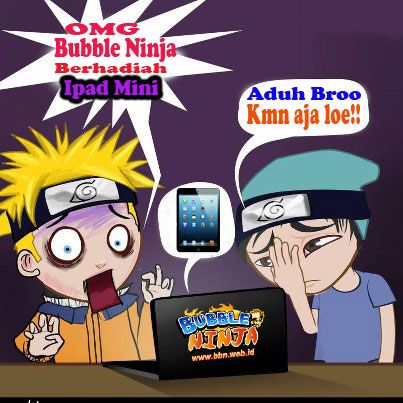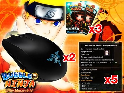 Ayee ayee, tinggal 10 hari lagi nihh Bubble Ninja Indonesia akan mengumumkan siapa saja yang beruntung dan mendapatkan hadiah “Razer Abyssus” di event Bubble Ninja Vaganza periode pertama ini. Shinobi dari semua server, Chidori ataupun Rasengan cukup melakukan top up minimal Rp 10.000,- pada saat event berlangsung, maka kalian berkesempatan mendapatkan item – item menarik maupun hadiah yang sangat keren dari Event Bubble Ninja Vaganza dengan Grand Prize sebuah Ipad Mini Wifi 16 GB spesial dari Bubble Ninja!