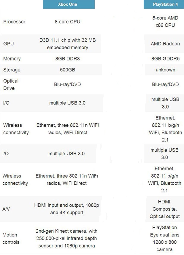 Meski Microsoft dan Sony sama-sama menggunakan prosesor dari AMD, namun bukan berarti kemampuan mereka sama. Tentu ada sesuatu yang diunggulkan dari setiap konsol. Jika Xbox One dan PlayStation 4 dibandingkan secara kemampuan, maka akan terlihat sisi plus dan minus dari kedua konsol ini. Kedua perusahaan sama-sama tidak mau kalah dalam mengunggulkan kemampuan dari konsol mereka masing-masing dengan mengatakan kalau mereka punya fitur-fitur unggulan yang tidak dimiliki oleh kompetitornya.