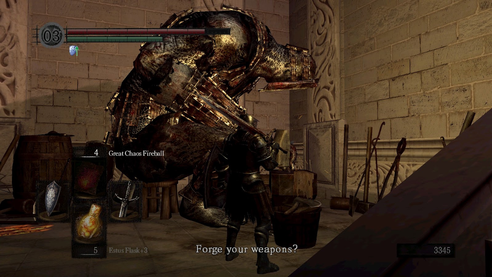 Selayaknya game RPG lainnya, tentu saja Dark Soul juga menyediakan jasa tempa untuk kita. Well, seperti biasa, tempa bisa kita lakukan pada Blacksmith. Nah bagi kalian nih yang mencoba melawan monster atau bos, kalian wajib menempa armor dan senjata kalian. Jangan pernah mengabaikan hal ini karena proses tempa akan memberikan kalian suatu ketahanan lebih dan status yang lebih baik. Untuk senjata juga tentunya kalian bisa juga menempa dan memperkuat dengan menambahkan elemen api, angin, listrik dan air. Nah biarpun skil kalian hebat, tentu saja peralatan ini wajib kalian perkuat jika ingin bertahan hidup.