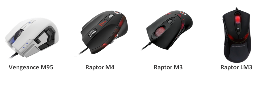 Dari jajaran gaming mouse, Vengeance M95 menjadi produk flagship yang didatangkan ke Indonesia. Vengeance M95 memiliki sensor laser 8200 DPI, dengan metal frame alumunium yang kuat dan dilengkapi 15 programmable button. M95 mampu menyimpan profil secara onboard sehingga gamer bisa menggunakannya di PC lain. Dari seri Raptor, telah hadir M4 yang memiliki sensor laser 6000 DPI dengan on-the-fly adjusment. Raptor juga memiliki fitur programmable button serta dapat diatur bobotnya. Sementara itu dari jajaran gaming mouse dengan optical sensor, Raptor M3 hadir dengan on-the-fly DPI switching dengan sensor avago ADNS-3080 1600 DPI, memiliki 6 buah programmable button dan glide pads yang ekstra besar. Produk gaming mouse terakhir yang telah tersedia adalah Raptor LM3. Produk ini memiliki material soft-touch yang nyaman dan ergonomis dalam genggaman, dilengkapi 6 programmable button dan optical sensor 2400-DPI yang dapat diatur secara on the fly sesuai kebutuhan. Produk-produk mouse ini memiliki kisaran harga tiga ratus lima puluh ribu hingga tujuh ratus lima puluh ribu rupiah.