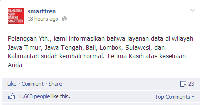 Untungnya kejadian tersebut tidak berlangsung lama. Satu jam setelah pengumuman turunnya layanan smartfren di lima wilayah tersebut, Smartfren langsung mengumumkan bahwa layanan mereka sudah kembali normal. Tetapi nasi sudah menjadi bubur, para pelanggan yang kecewa menumpahkan komplain ke Fanspage resmi Smartfren. Para pelanggan yang kecewa akan tumbangnya layanan tersebut memposting koment di Fanpage resmi Smartfren. Pasalnya pelanggan masih mengeluhkan lambatnya jaringan smartfren bukan hanya di beberapa wilayah yang terkena dampak gangguan melainkan diseluruh wilayah indonesia.