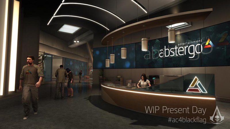 Terlihat pada gambar Abstergo Entertaiment. Abstergo baru yang muncul dengan teknologi yang makin canggih, makin besar dan tentunya makin kejam! Teknologi canggih yang mereka kembangkan saat ini memungkinkan siapapun untuk mengakses memori orang lain, termasuk leluhur mereka. Karena alasan inilah, sang pegawai Abstergo ini mampu masuk dalam kisah Edward Kenway walaupun tidak memiliki hubungan darah sama sekali dengan Desmond. Apakah kali ini kisah Abstergo akan kembali muncul kepermukaan?