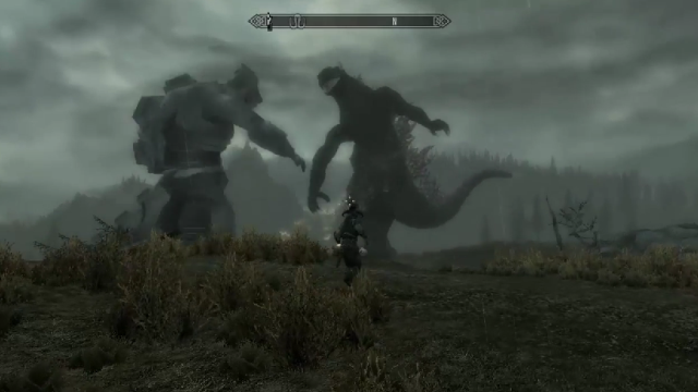 Cuaca gelap mendung dan petir berkilatan dimana-mana menambah cekam suasana Map Skyrim ditambah dengan adanya dua Godzilla yang sedang bertarung didepan. Dua Godzill yang sedang bertarung ini pun terlihat sangat ganas ditambah dengan suara khasnya yang melekik bagaikan sedang tersiksa. Berikut videonya: