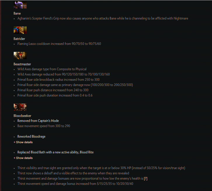 - Valve menambahkan efek Aghanim pada Bane. Jika Bane telah build Aghanim dan melakukan fiend grip pada musuh dan musuh menyerangnya maka mereka akan terkena efek nightmare.