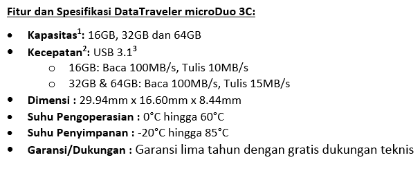 DataTraveler microDuo 3C merupakan cara yang ideal untuk memberikan kapasitas ekstra 64GB pada setiap smartphone, tablet dan komputer Mac terbaru sementara juga dapat bekerja dengan perangkat generasi yang sudah ada. Akan mulai dipasarkan pada bulan ini, drive yang dapat dioperasikan dengan plug and play ini menawarkan kinerja cepat USB 3.1 dengan kecepatan baca hingga 100MB/s dan kecepatan tulis hingga 15MB/s. Sangat ringan dan berbentuk kecil DataTraveler microDuo 3C melengkapi perangkat portable dan mudah di bawa.