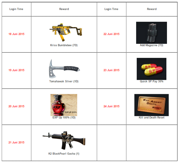 Pada event ini, bila pemain bermain dalam waktu yang ditentukan, pemain akan mendapatkan “reward” yang sangat menarik, berikut hadiah yang bisa didapatkan pemain di Special Force 2 pada periode event ini :
