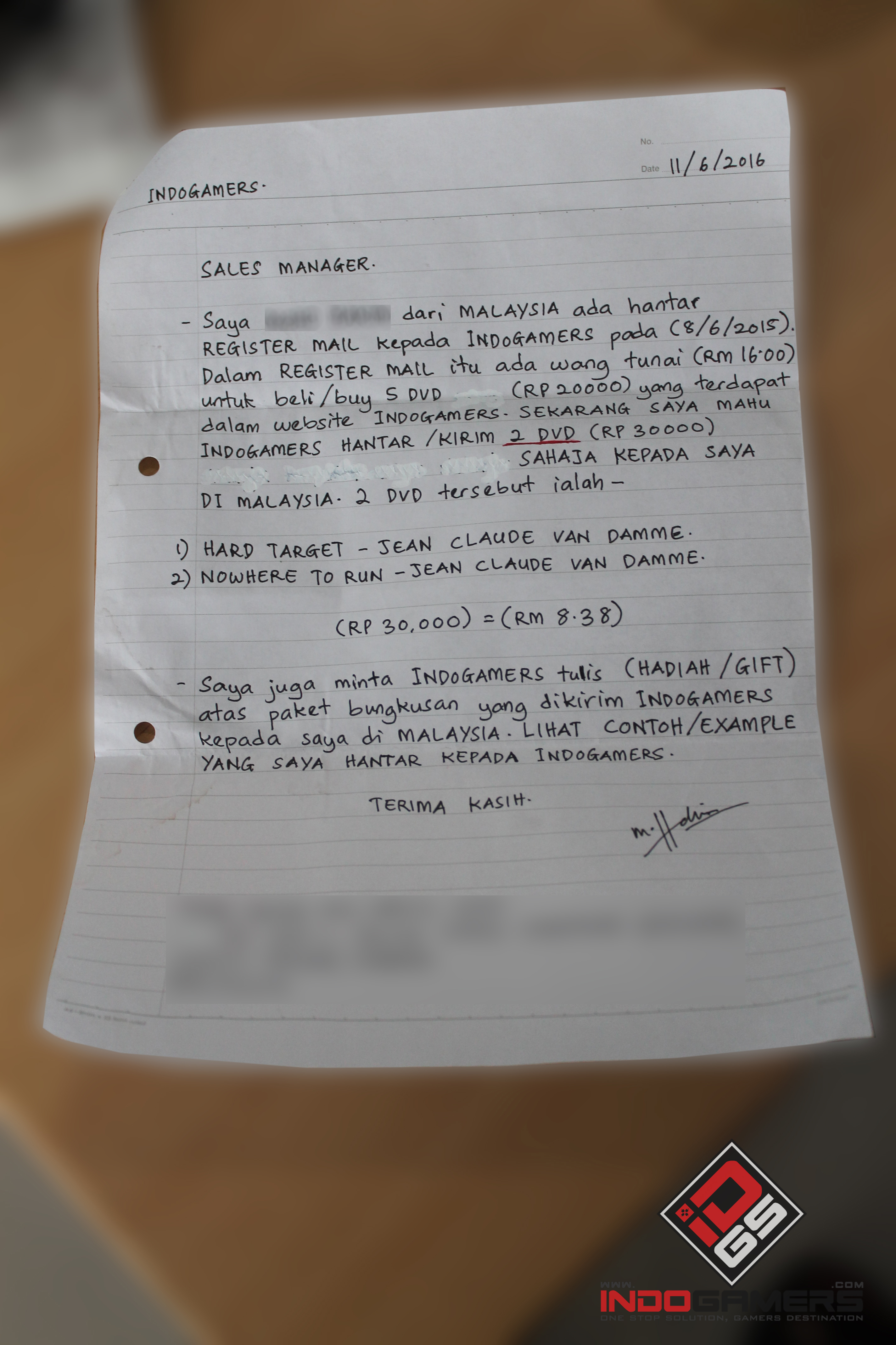 Dalam surat tersebut, ia mengatakan "Saya Upin (Nama Samaran) dari MALAYSIA ada hantar REGISTER MAIL kepada INDOGAMERS pada (8/6/2015). Dalam REGISTRASI EMAIL itu ada wang tunai (RM 16.00) untuk beli/buy 5 DVD (RP 20.000) yang terdapat dalam website Indogamers. Sekarang saya mahu Indogamers HANTAR/KIRIM 2 DVD (RP 30000) SAHAJA KEPADA SAYA DI MALAYSIA."