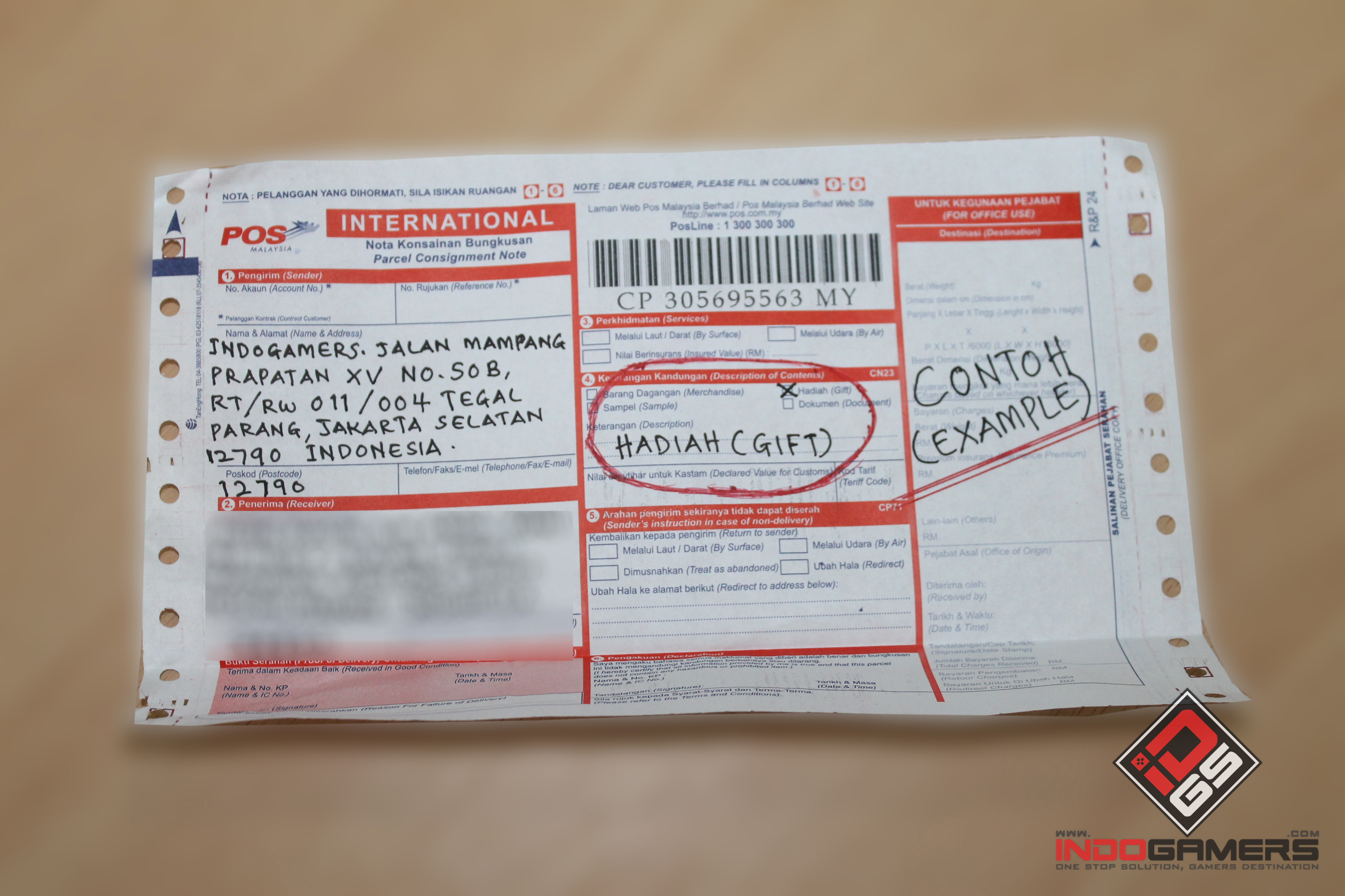 "Saya juga minta INDOGAMERS tulis (HADIAH/GIFT) atas paket bungkusan yang dikirim INDOGAMERS kepada saya di MALAYSIA. LIHAT CONTOH/EXAMPLE YANG SAYA HANTAR KEPADA INDOGAMERS", ujar penulis surat tersebut.