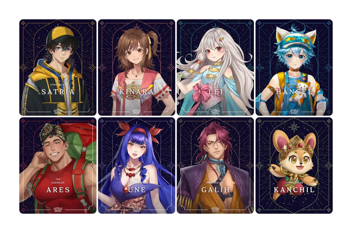 Astral Bond telah memperkenalkan beberapa karakter utama beserta satu maskot unik yang akan mendampingi pemain dalam menjelajah dunia permainan.