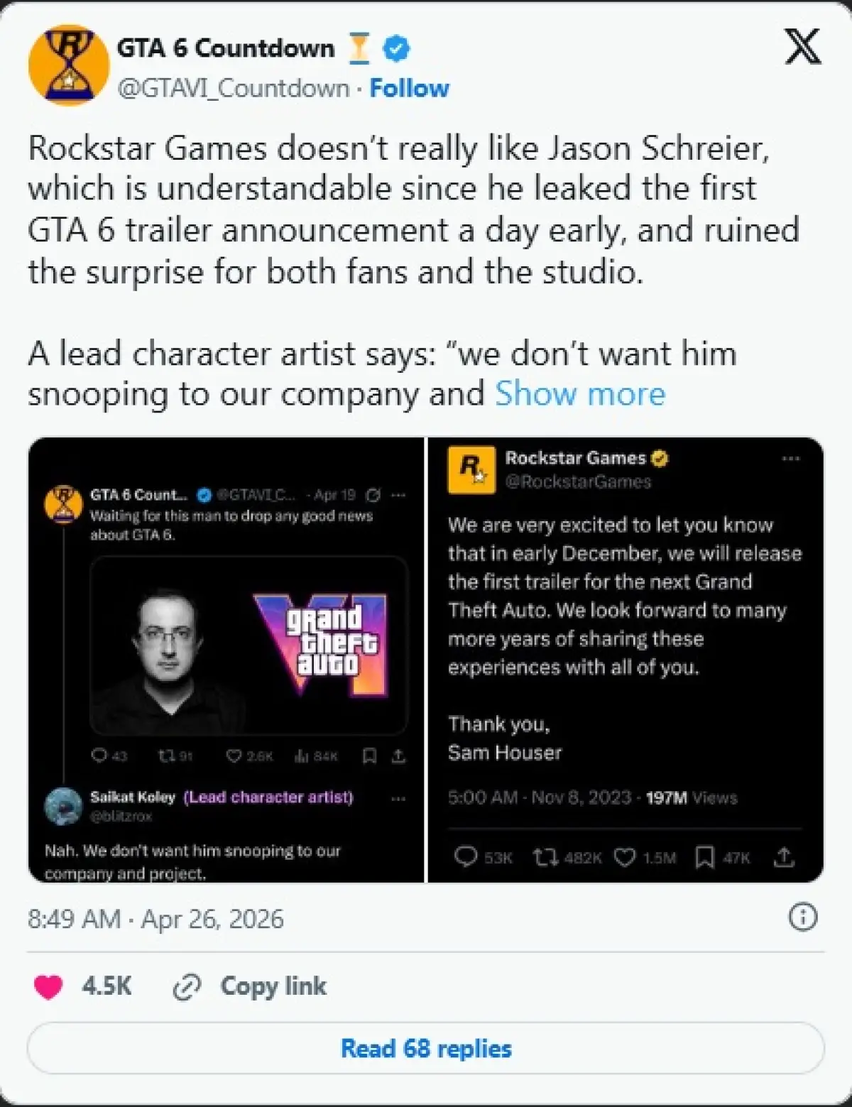 Jason Schreier sendiri memiliki sejarah unik dengan Rockstar. Ia berhasil membocorkan trailer perdana GTA 6 hanya beberapa jam sebelum pengumuman resmi. Bahkan ada rumor yang menyebut Rockstar sempat ingin menunda pengumuman tersebut hanya untuk mengerjai Schreier dan ceritanya.