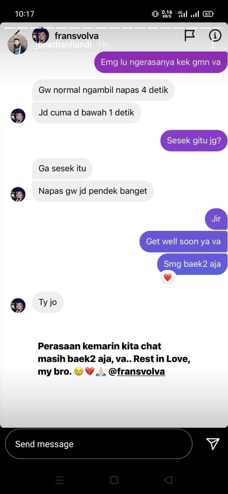 Selain Ranger Emas, eks pro player EVOS Esports, Jonathan 'Emperor' Liandi rupanya juga sempat berkomunikasi dengan Volva sebelum ia dikonfirmasi meninggal dunia, di mana Volva mengaku kesulitan bernapas.