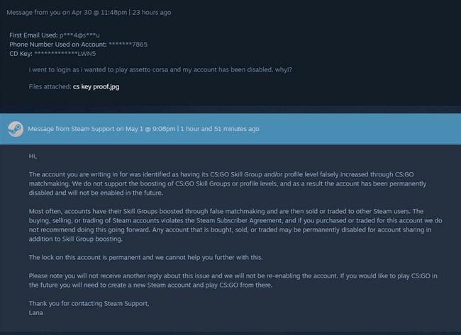 "Akun yang anda tuliskan telah diidentifikasi menaikkan Skill Group CS:GO dan level profil dengan cara yang tidak dibenarkan lewat matchmaking CS:GO. Kami tidak mendukung penaikan Skill group dan level profil seperti ini, dan sebagai hasilnya, akun tersebut telah dinon-aktifkan secara permanen dan tidak akan diaktifkan lagi di masa depan."