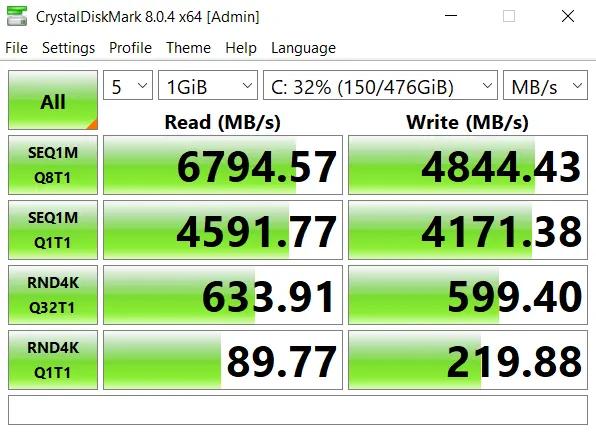 Penyimpanan (unit laptop kami coba) M.2 NVMe 512 yang berjalan di transfer mode PCIe 4.0 x4 mampu mencapai kemampuan read hingga 6794MB/s dan write 4844MB/s. Kencang bukan?