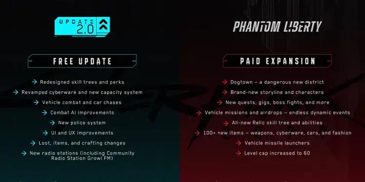 DLC berbayar Phantom Liberty dijadwalkan rilis 26 September 2023. Sedangkan pembaruan gratis patch 2.0 belum ada informasi pasti. Spekulasi di jagat maya menyebutkan kuat dugaannya bahwa patch tersebut juga dirilis di tanggal yang sama atau beberapa hari sebelum perilisan Phantom Liberty.