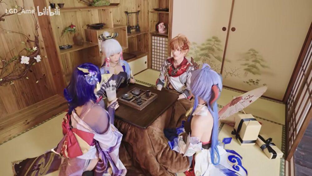 Ame tidak sendirian. Dalam video yang diunggah di BIlibili tersebut, Ame juga memainkan mini-drama bersama tiga cosplayer cantik yang masing-masing memerankan tiga karakter populer di Genshin Impact lainnya: Ganyu, Ayaka, dan Raiden Shogun.